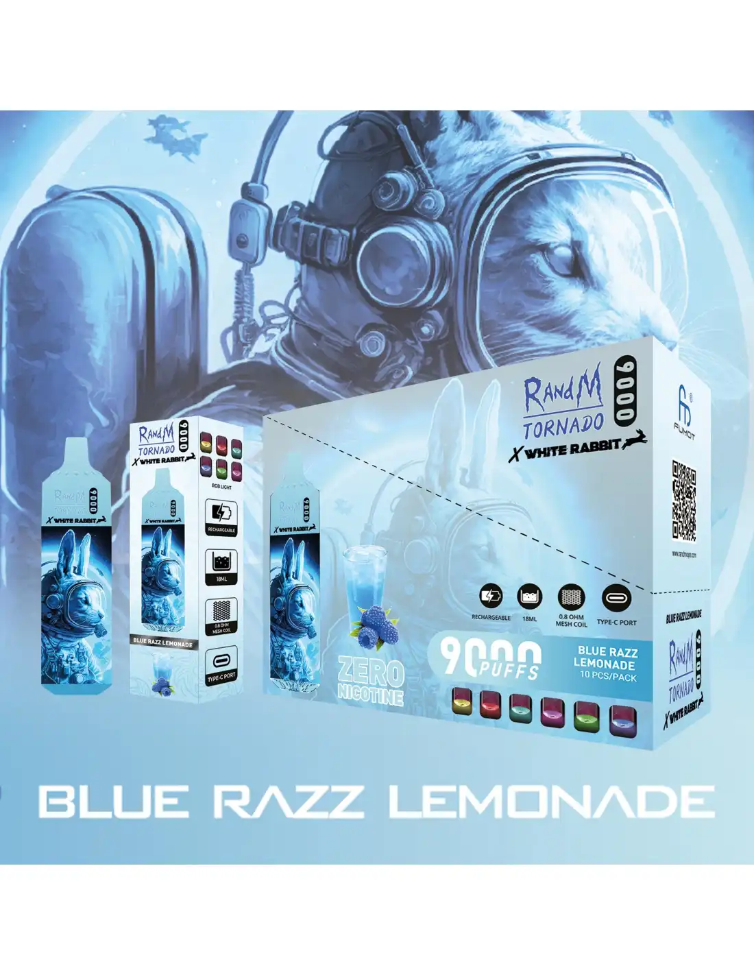 RandM Tornado é um vape descartável de 9000 puffs de uma das marcas mais famosas a nivel mundial que em parceria com a White Rabbit lançaram uma linha nova de sabores frutados muito saborosos num equipamento de bateria recarregável via usb-c com 800mAh de autonomia.