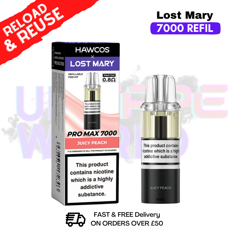 Discover the vibrant flavour of Juicy Peach with this replacement pod for your Lost Mary 7K Pro Max Pod Kit. Delivering up to 7000 puffs per pod, this prefilled pod brings Sweet, ripe peach bursting with juicy freshness, delivering a smooth and refreshing vape.